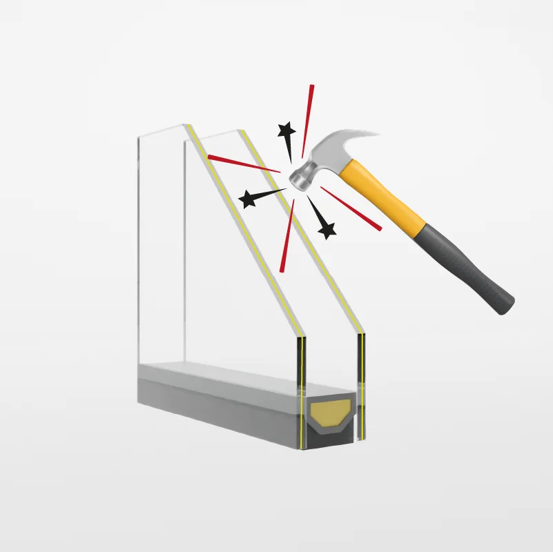 5× bardziej odporna na uderzenia niż szkło zwykłe. Po rozbiciu rozpada się na małe tępokrawędziste kawałki — minimalne ryzyko skaleczenia. Wymagana normą w przeszkleniach do podłogi.