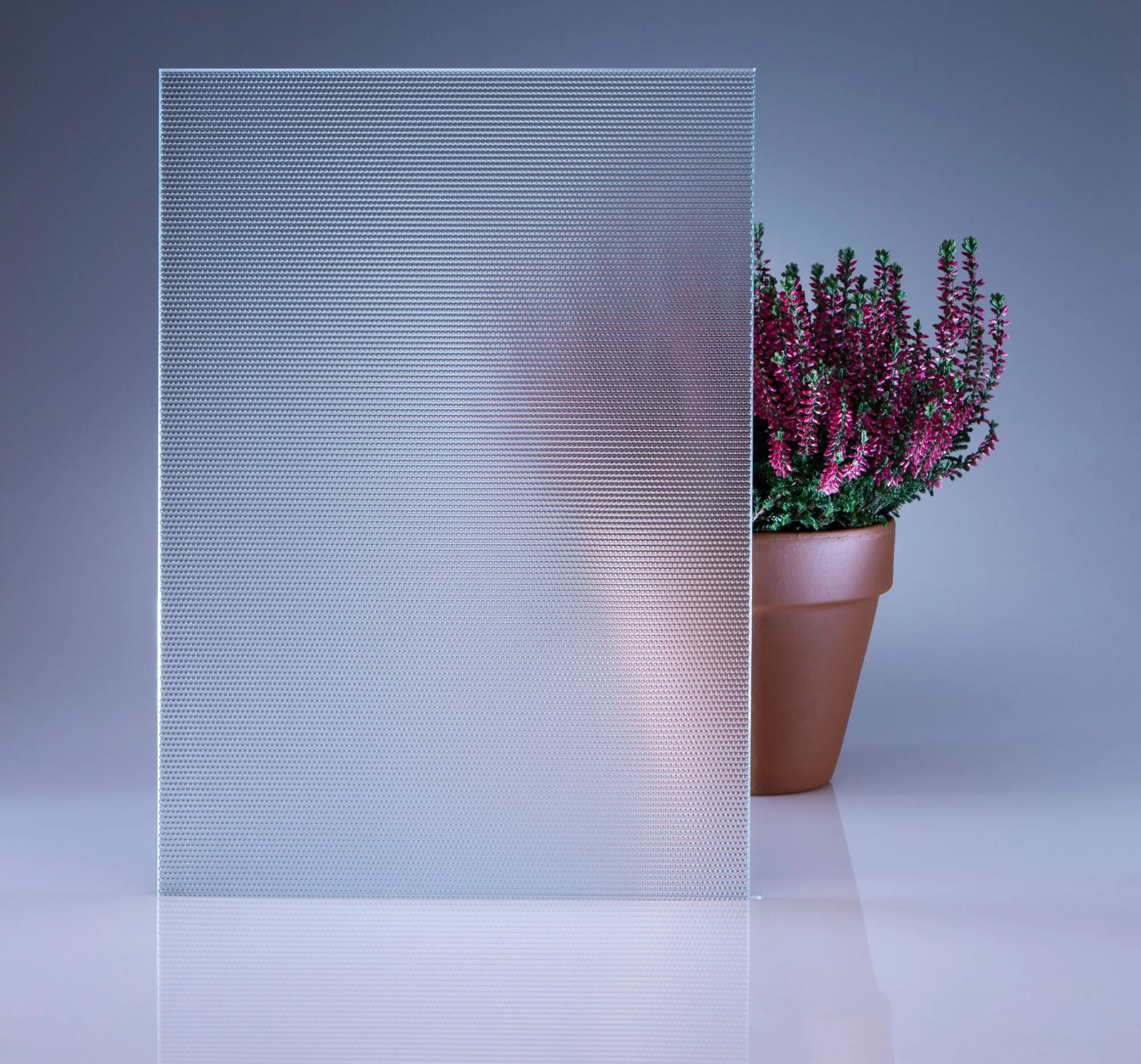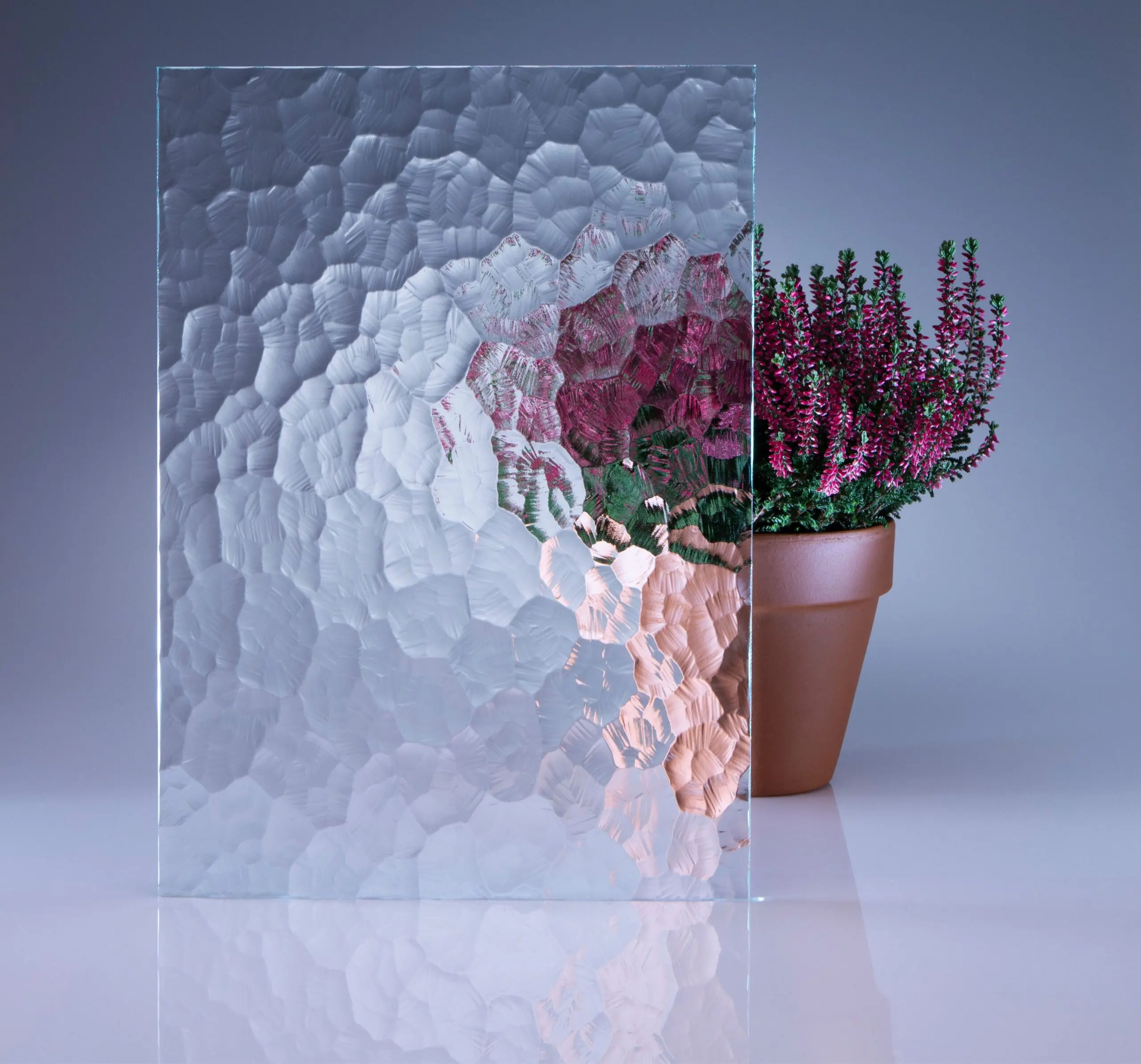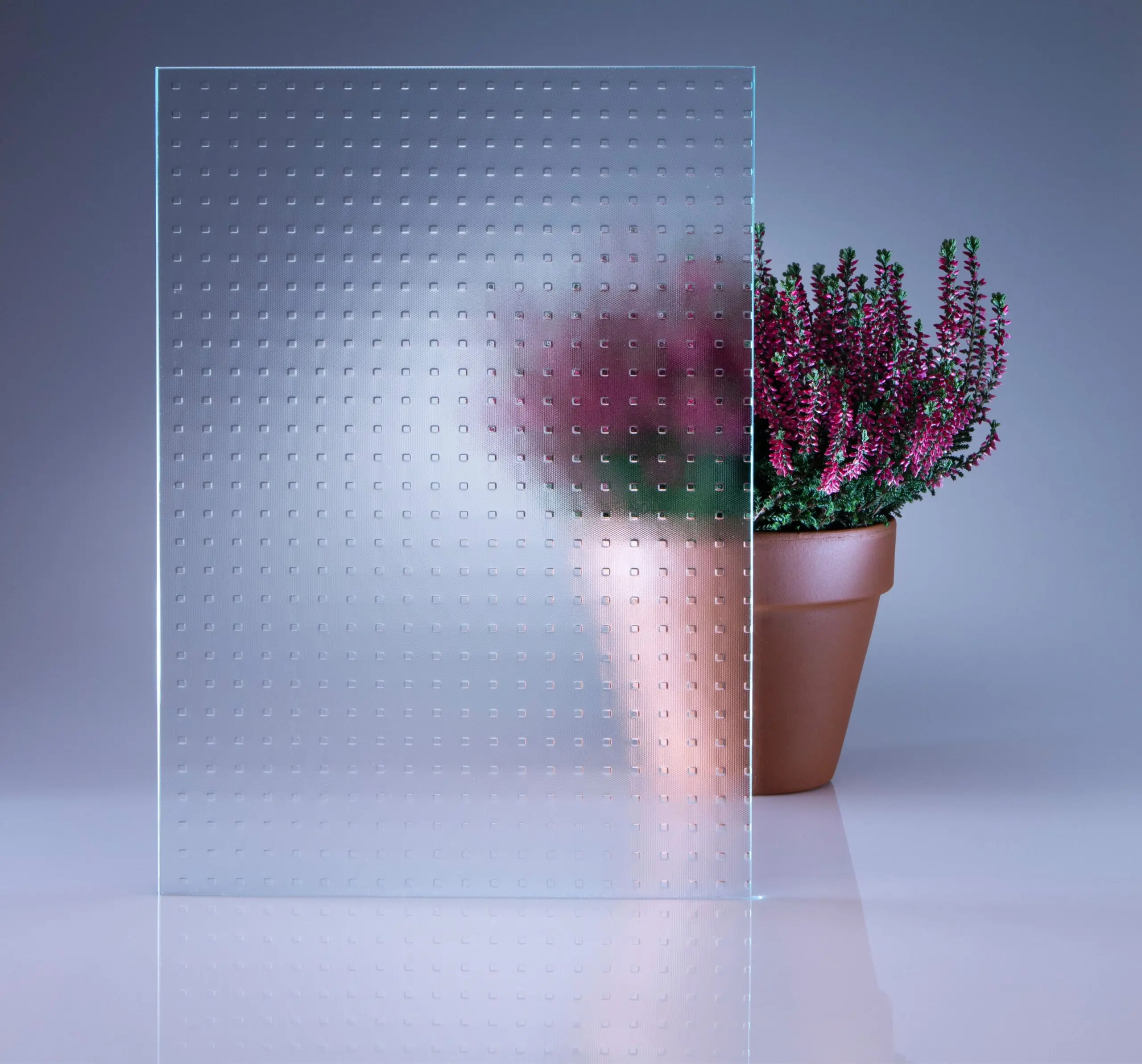 Wzór drobnych ziarenek piasku zapewniający delikatny efekt matowienia. Wysoka przepuszczalność światła przy pełnej prywatności.