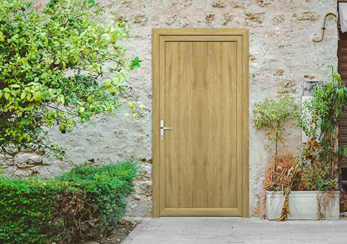 Solidne drzwi wejściowe PVC z wielokomorowym profilem zapewniają doskonałą izolację termiczną i akustyczną.